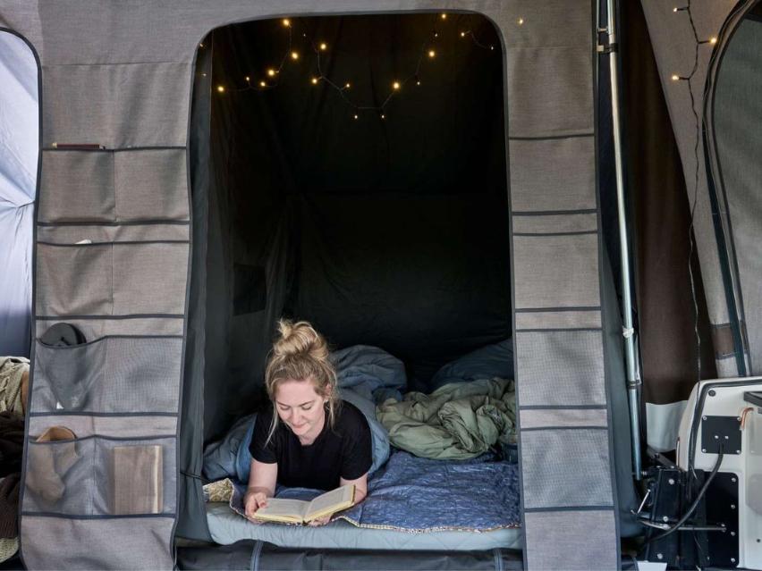 Som standard har den kompakte men rummelige teltvogn 4 sovepladser (8 ved tilkøb af annexer på begge sider) fordelt i to sovekabiner med behagelige koldskums-madrasser. I begge sovekabiner får du unikke ventilationsmuligheder, myggenet samt mørke sovekabiner.