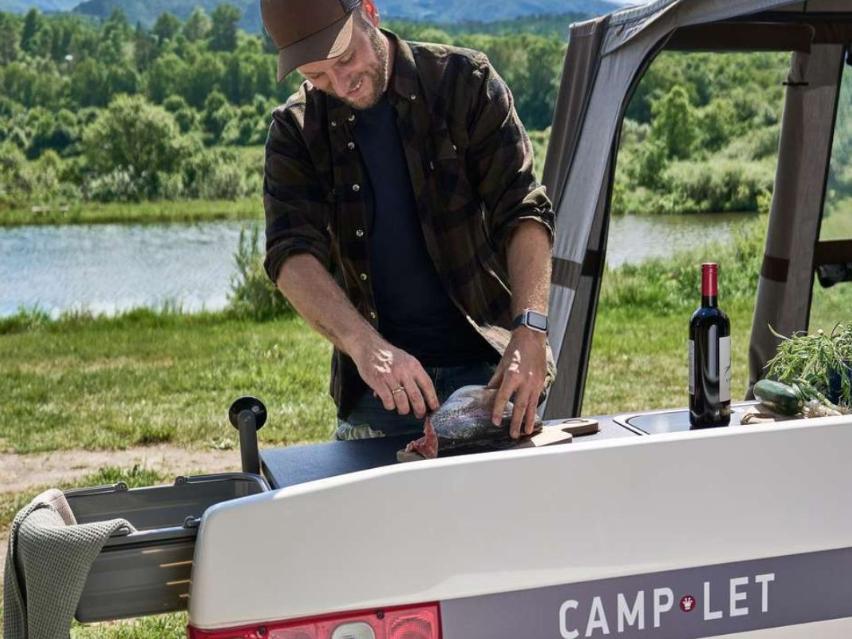Du har mulighed for at tilføje et køkken til din Camp-let Earth. Bordplade, vandbeholder og elektrisk vandpumpe følger med i et standard køkken og hertil kan du vælge integrerede gasblus og ekstra opbevaring. Til din udendørsmadlavning kan du tilkøbe et Passion køkkensolsejl, som giver dig ly for regnen og skygge for solen.