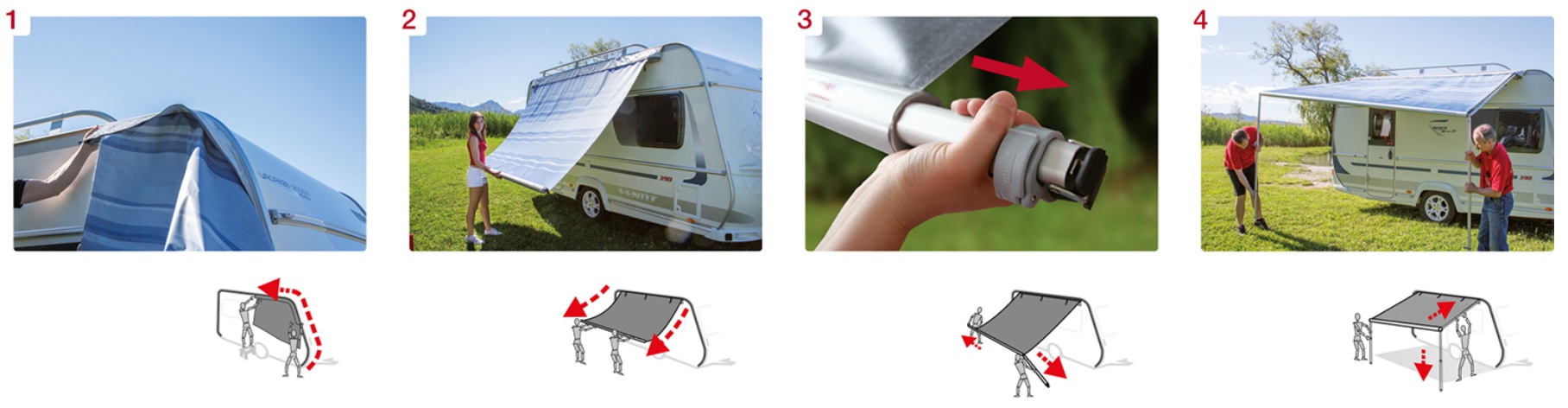 Fiammas Caravanstore posemarkise er let at benytte sig af og at installere. Det tager kun 45 sekunder at rulle markisen ud. Den kraftige markise, og det "krølle-frie" materiale, gør det let at rulle markisen ind og ud.