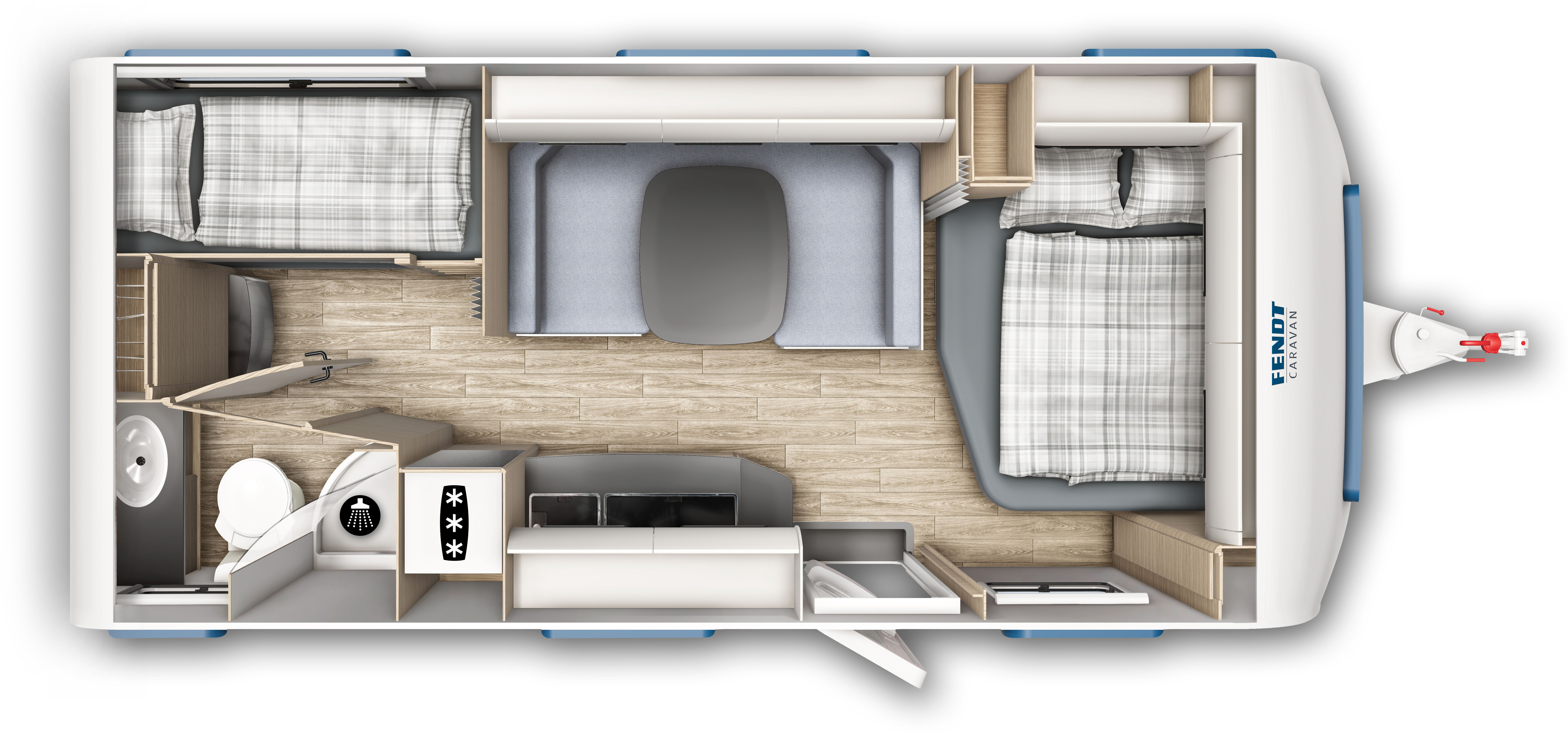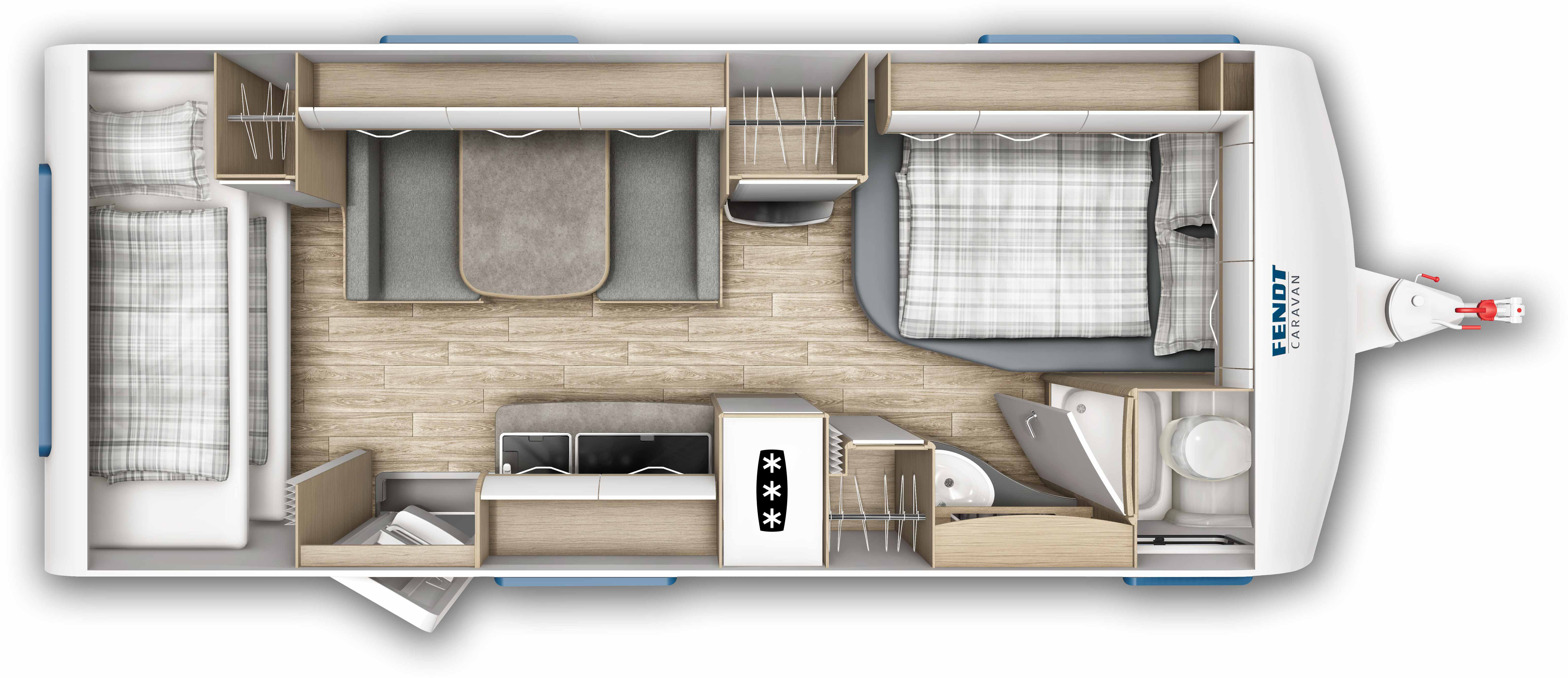I de fleste modeller af campingvogne med dobbeltseng og køjer, står køjesengen i den ene ende og dobbeltsengen i den anden ende.