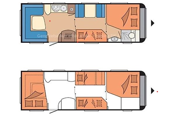 Til familier der ønsker køjer og enkeltsenge, er køjerne som oftest indrettet på tværs af vognen op ad endevæggen eller for enden langs med vognens langside. Den modsatte side er her typisk benyttet til badeværelse.